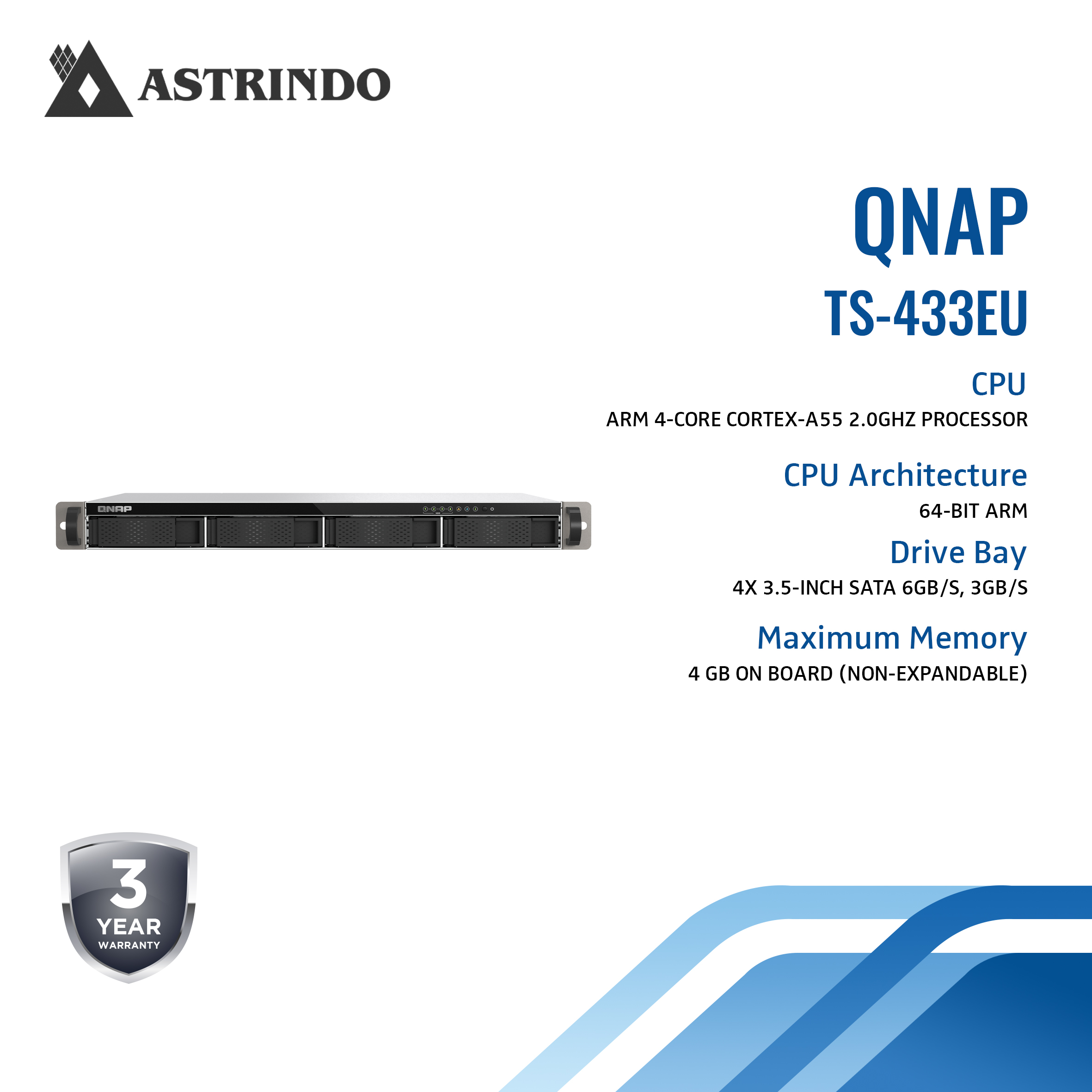 QNAP QNAP TS-433eU 4-Bay NAS, 1U Rackmount Design, Short Depth, Edge Storage, File Management, Docker Con (TS-433EU)